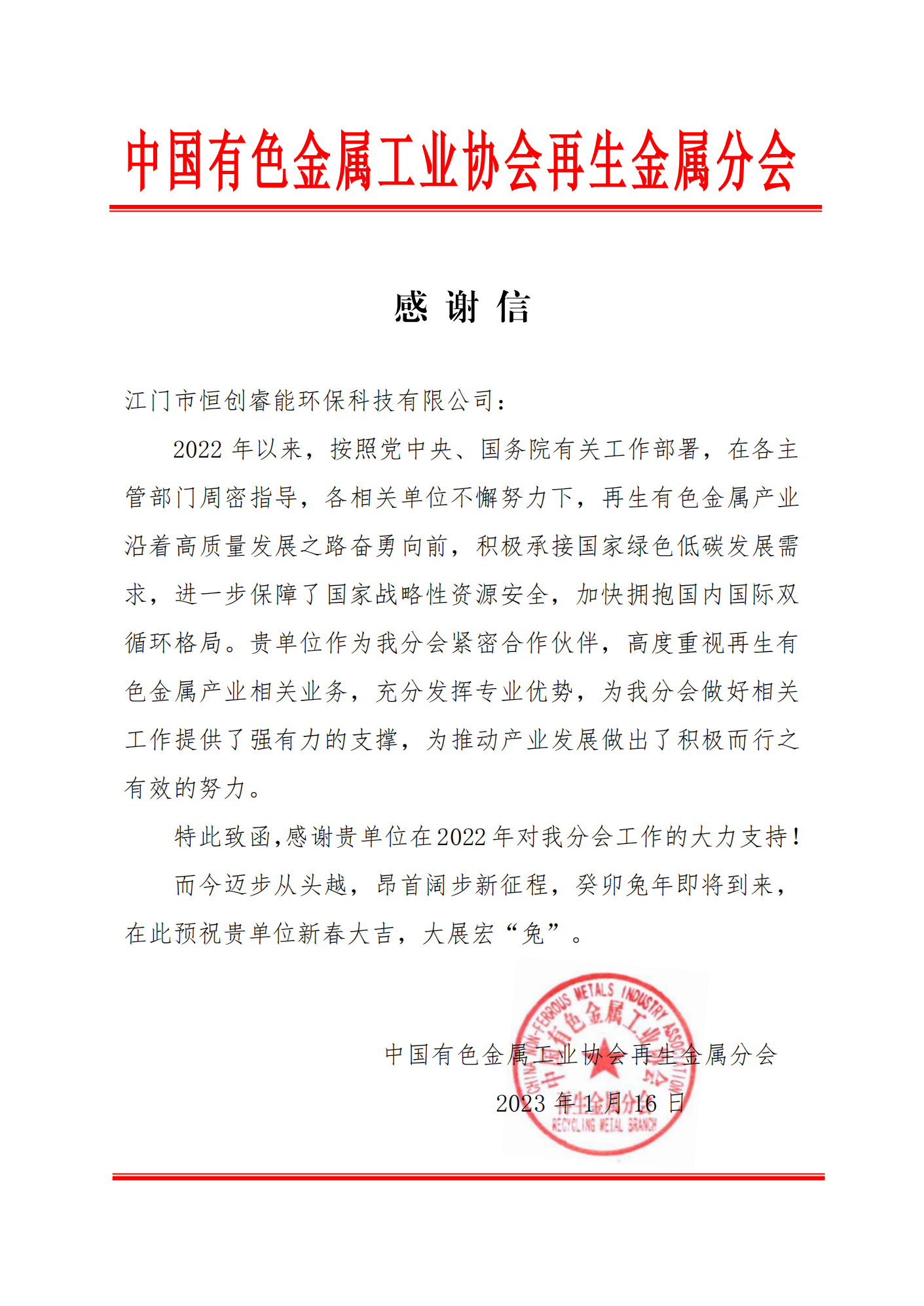近日,我司收到有色金屬工業(yè)協(xié)會再生金屬分會發(fā)來的感謝信。信中對我司高度重視再生有色金屬產(chǎn)業(yè)相關(guān)業(yè)務(wù),充分發(fā)揮專業(yè)優(yōu)勢為相關(guān)工作提供大力支持,同時為推動產(chǎn)業(yè)發(fā)展做出了積極而有效的努力給予了充分的肯定。